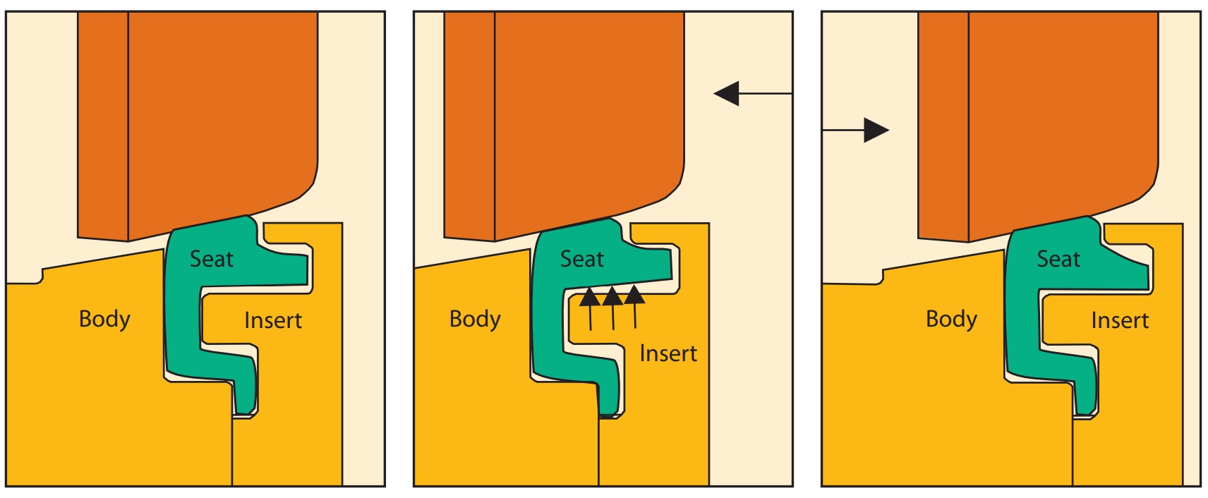 In this configuration, the disc is eccentric, or offset, from the valve seat. As the disc starts to rotate, it moves away from the seat instead of across it. This design actually uses the line pressure to help give it its seal. This feature allows the use of offset butterfly valves in high‐pressure applications such as ethanol or HVAC. It generally uses PTFE or plastic as its seat material, but metal seats are also available to meet fire‐testing specifications like API 607.