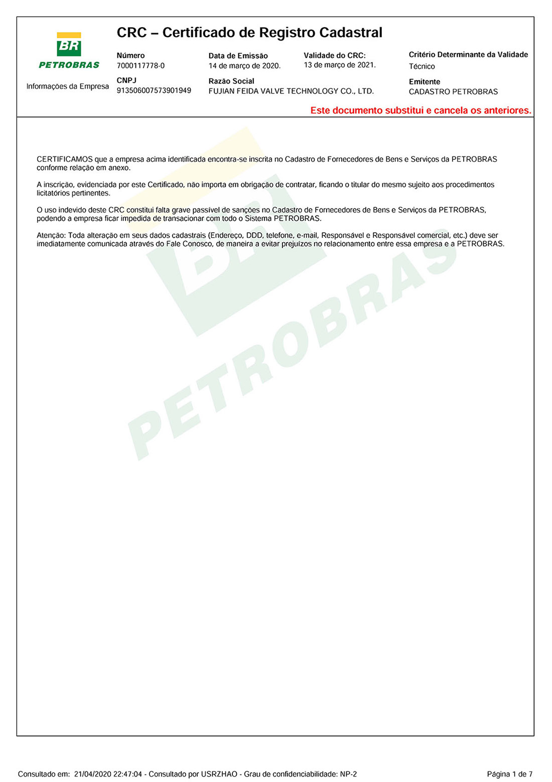 Fevaltec GET PETROBRAS CRC CERTIFICATE UPDATED. The new CRC valid until 2021.